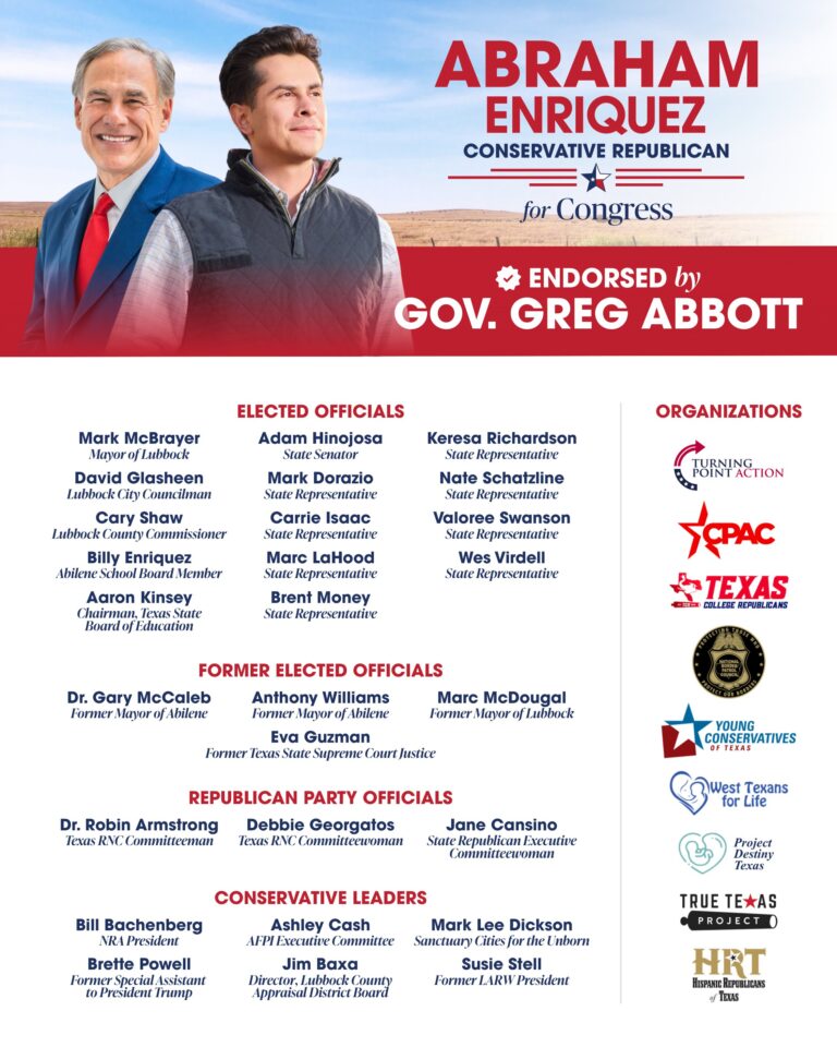 By providing your phone number, you are consenting to receive text message updates, including automated text messages (updates, marketing, polling/surveys, and possible donation solicitations) to that number from Abraham Enriquez for Congress. Message & Data rates may apply, and message frequency may vary over time. Reply "STOP" to opt out of these text message updates. Reply HELP for help. Privacy Policy.